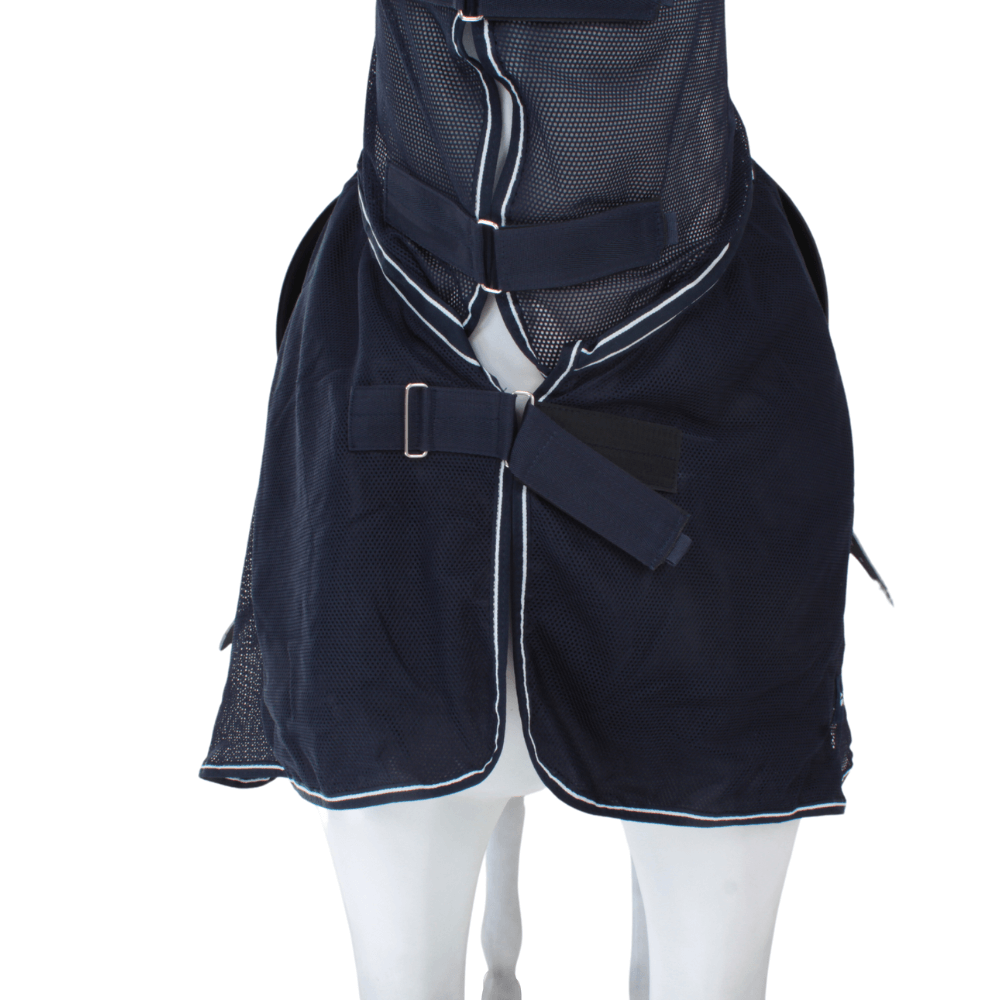 La couverture se fixe à l'avant du poitrail à l'aide de deux fermetures à pression. Sur le dos, la couverture dispose d'une découpe pour les selles classiques. La couverture est également dotée d'une protection de queue avec courroie de queue.